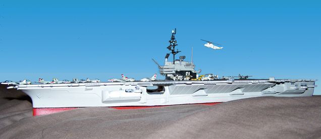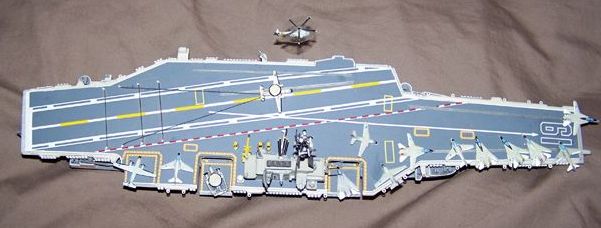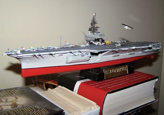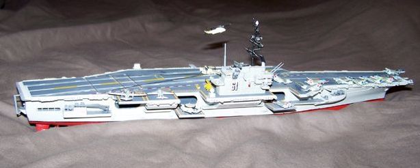 | In all, the model took about a year to complete. Some of the delay was because of bad cataracts and unable to see to do small detail work, such as gluing the props to the E-2s and applying the star and bars decals to the aircraft.  I actually waited about 8 months between the completion of the ship and doing the small detail work and applying the decals after my cataract surgeries.  The kit is a 1/800 scale Arii model with some modifications to the starboard forward sponson.  The port side forward sponson, island and some of the aircraft actually were salvaged from a model that was about 85% completed when it was destroyed by someone who broke into our house and trashed things looking for stuff easy to pawn of sell.  That was in April of 2007.  The hangar deck was the base for a waterline model and glued in place with support glued along the inside of the hull.  I hand drilled holes to add the black thread for the arresting gear. |