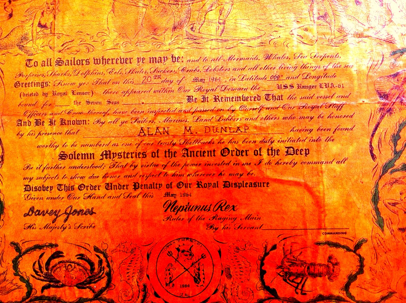 Shellbacks he has been duly initiated into the Solemn Mysteries of the Ancient Order of the Deep. Be it further understood: That by