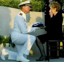 Former first lady Nancy Reagan accepts the American flag which draped the casket of her husband, former United States president Ronald Reagan from United States Navy Captain James A. Symonds, commanding officer of the USS Ronald Reagan, during burial services for Reagan at the Ronald Reagan Presidential Library in Simi Valley, California, June 11, 2004